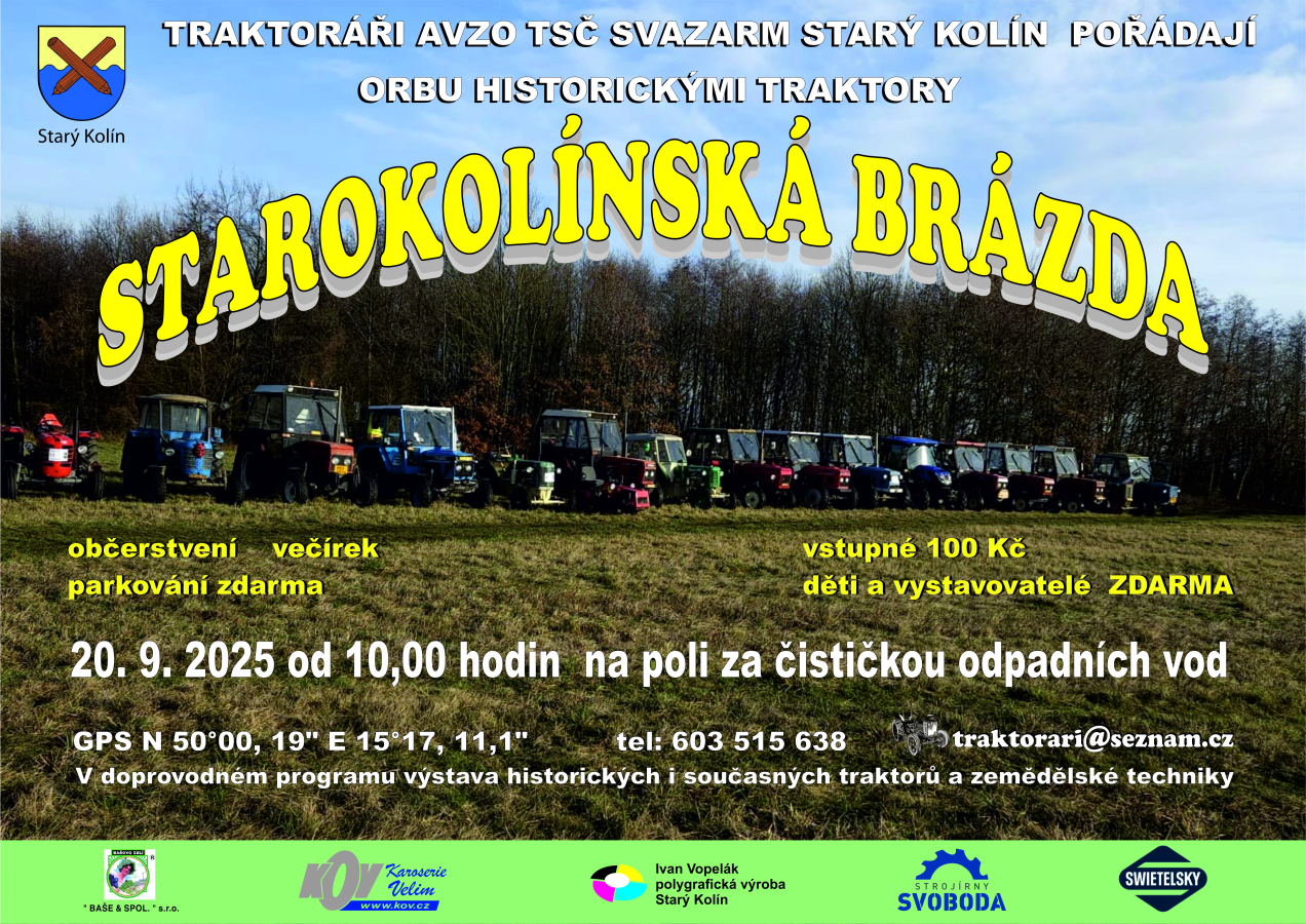 Vážení spoluobčané AVZO-TSČ-ČR, Svazarm Starý Kolín klub Traktoráři, Vás co nejsrdečněji zve na tradiční Starokolínskou Brázdu, která se koná 20.9.2025 od 10:00 hodin v prostorách pole u Čističky odpadních vod ve Starém Kolíně. Připravena je prezentace historické zemědělské techniky a orba traktory, oblíbené kulinářské speciality, živá hudba a atrakce pro děti. Vstupné 100 Kč, děti zdarma, vystavovatelé techniky zdarma. Jste všichni co nejsrdečněji zváni."