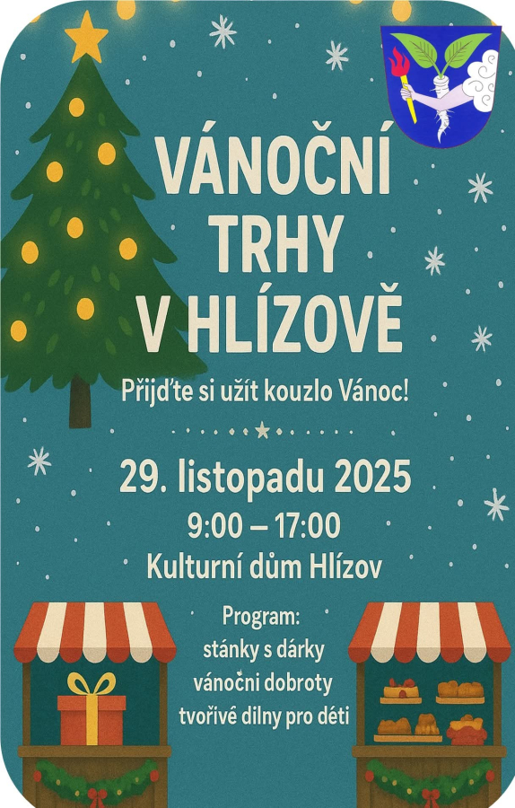 Srdečně vás zveme na Vánoční trhy v Hlízově, které se uskuteční v sobotu 29. listopadu 2025 od 9:00 do 17:00 hodin v Kulturním domě v Hlízov.